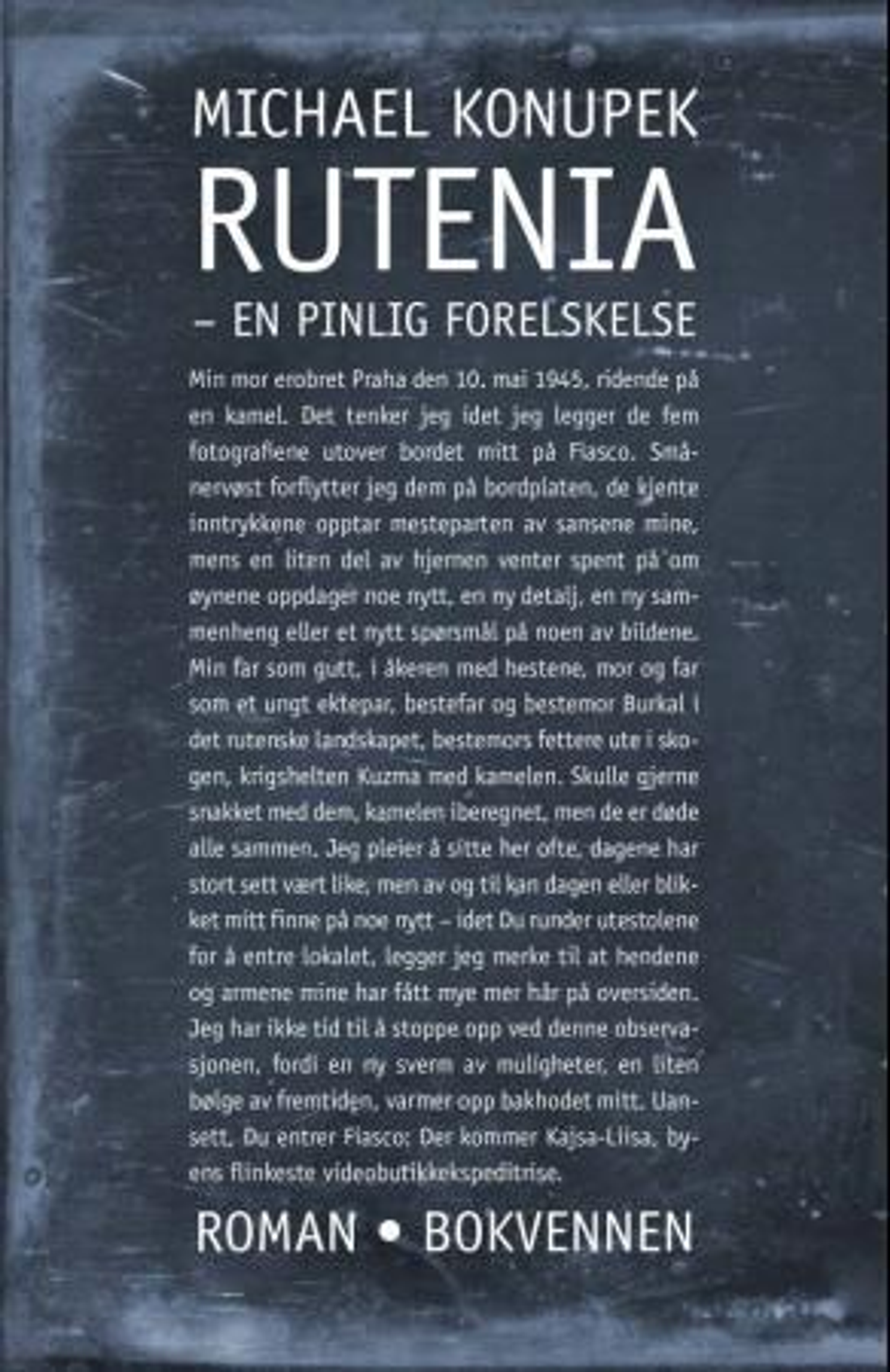Rutenia er et glemt, lite land i det østlige Sentraleuropa, et land som ikke rakk å frigjøre seg i tide. Derfra kommer Miroslavs mor ridende til Praha på en kamel i 1945. Tretti år senere flykter sønnen til Norge. Miroslav Klondácek blir til Mike Klondyke. Utstyrt med seks fotografier leter Mike etter historiene som brakte ham hit, til puben Fiasco i Oslo. Der venter han på den rette anledningen til å erklære sin kjærlighet til byens flinkeste videoekspeditrise, finske Kajsa-Liisa. I Rutenia blir vi kjent med et rikt persongalleri: Trommisen Jacek, Sokrates-forskeren Jan Henrik, rallykjøreren Willy, urkapitalisten Freddy, krigskorrespondenten Ulf, skruelagersjefen Arild, og en hel del av kvinnene de har møtt i årenes løp, blant annet den smarte massøsen Ewa. Alle forsøker å gjøre det beste ut av livets tilbud, de har det fint, men blir hjemsøkt av det forrige århundre hver eneste natt. Imens sliter Mike med sine egne store spørsmål: Må man vente til man blir 60 for å treffe den rette? Er Iladalen Oslos svar på Shangri La? Om forfatteren: Michael Konupek, født 1948 i Praha, bosatt i Oslo siden 1977. Han debuterte med den kritikerroste romanen Böhmerland 600 cc i 1987. Romanen I sin tid (1993) ble hovedbok i Bokklubben Nye Bøker, og har allerede rukket å blitt en klassiker innen norsk eksillitteratur. Rutenia er hans tredje roman.